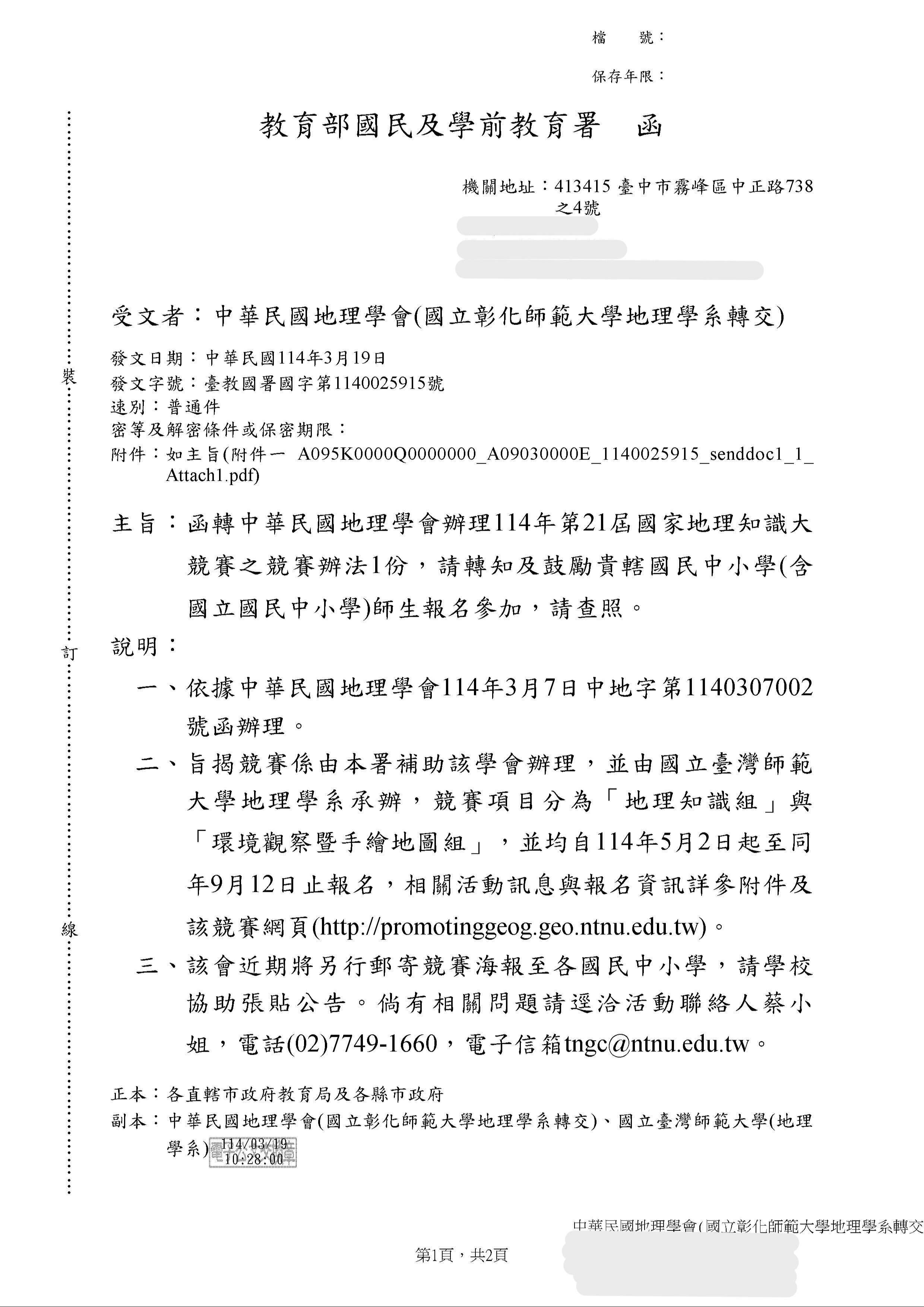 說明: 一、依據教育部國民及學前教育署114年3月19日臺教國署國字 第1140025915號函辦理。 二、旨揭競賽係由教育部國民及學前教育署補助該學會辦理, 並由國立臺灣師範大學地理學系承辦計畫,本校承辦「地 理知識組」的縣市複賽。 三、賽項目分為「地理知識組」與「環境觀察暨手繪地圖 組」,並均自114年5月2日起至同年9月12日17:00止報名, 鼓勵各校師生參與。相關活動訊息與報名資訊詳參附件及 該競賽網頁(http://promotinggeog.geo.ntnu.edu.tw /)。