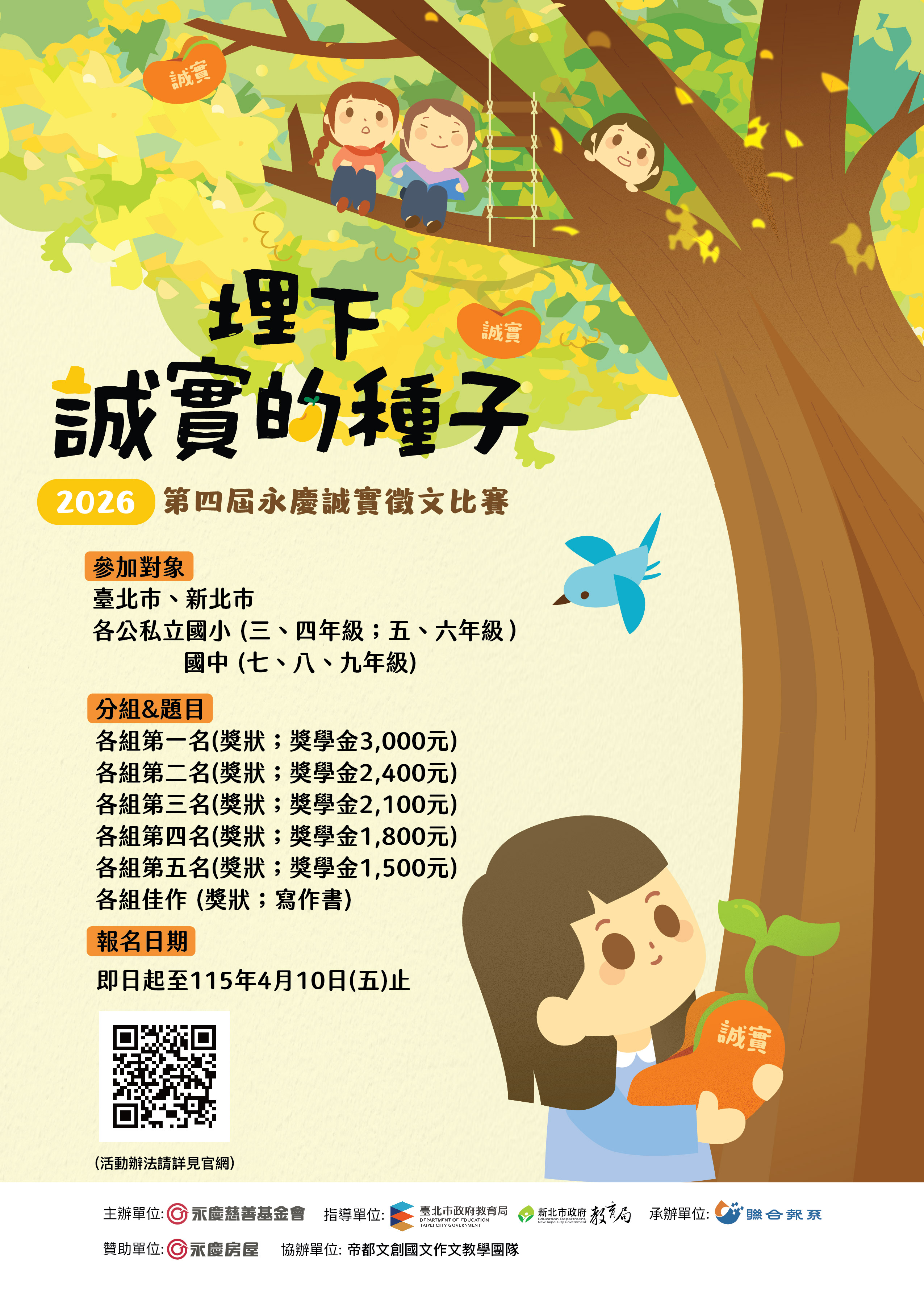 二、旨案乃為透過徵文活動,培養學生對於生活的觀察力,並 從寫作中探索自我價值與思潮,讓品格教育的觀念向下扎 根,以「埋下誠實的種子」為主題,希望學生從將品格素 養融入文字的過程中,亦將優良德行落實於日常生活、徵 文活動內容摘要如下: